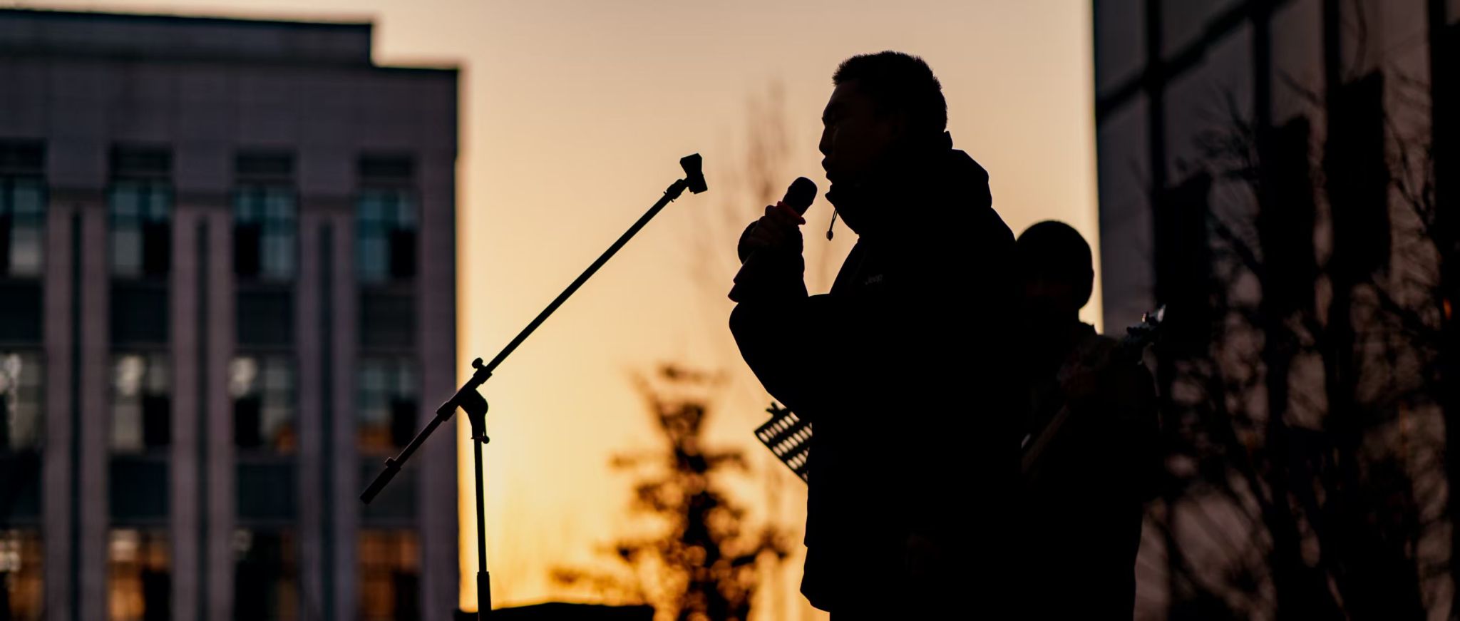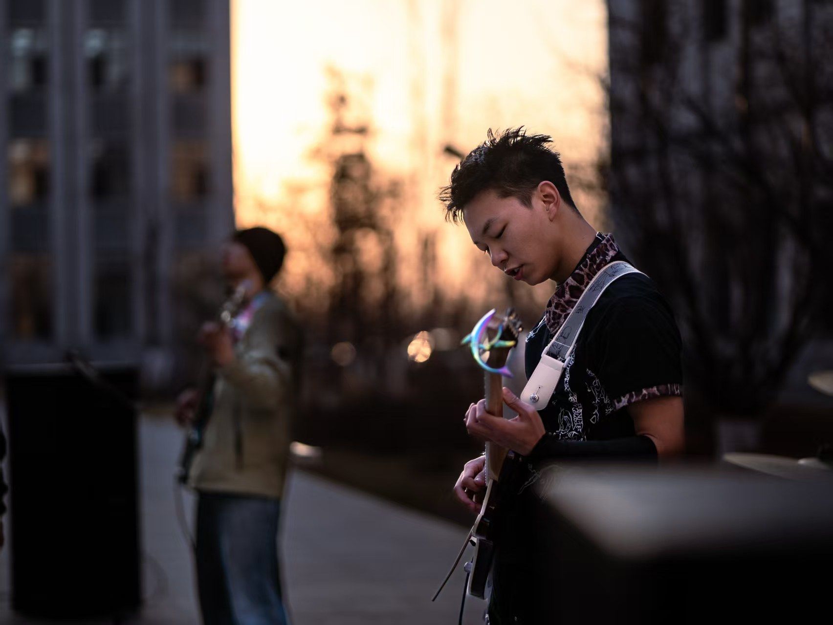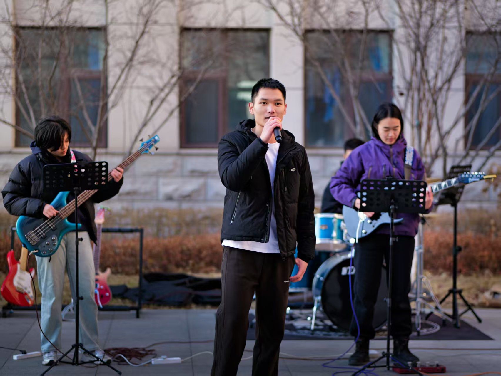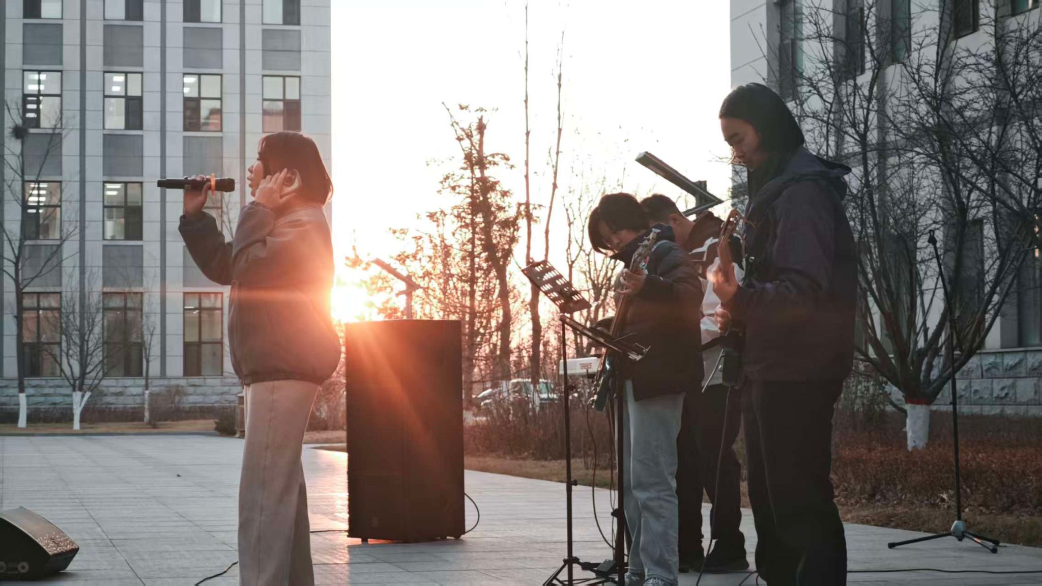 活动中,开场曲电吉他音浪引爆全场;《光年之外》的键盘旋律柔化婉转,舞台下观众轻声和唱;《稻香》的木吉他裹着暖调,青年学生的飒爽与韵律里的侠气在此刻同频。以琴系远方,以歌绘星辰。当旋律与藏蓝相遇,青年意气便成了蒲河最暖的冬阳,成了藏蓝青春最生动的注脚。