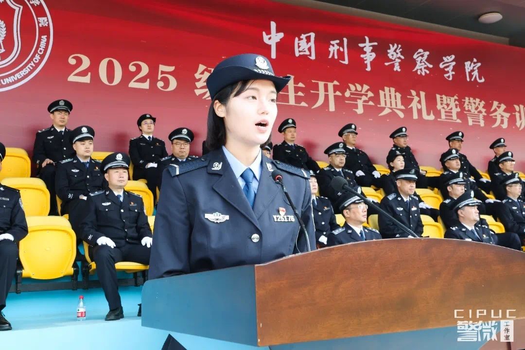 研究生代表湛宇菲同学在发言中表示,将坚定理想信念、勇攀学术高峰、砥砺初心使命,带着警务训练中铸就的坚韧,将对党忠诚融入血脉、刻进灵魂,以问启智、向新而行,让人生因选择藏蓝而无悔,让青春因从警报国而精彩。