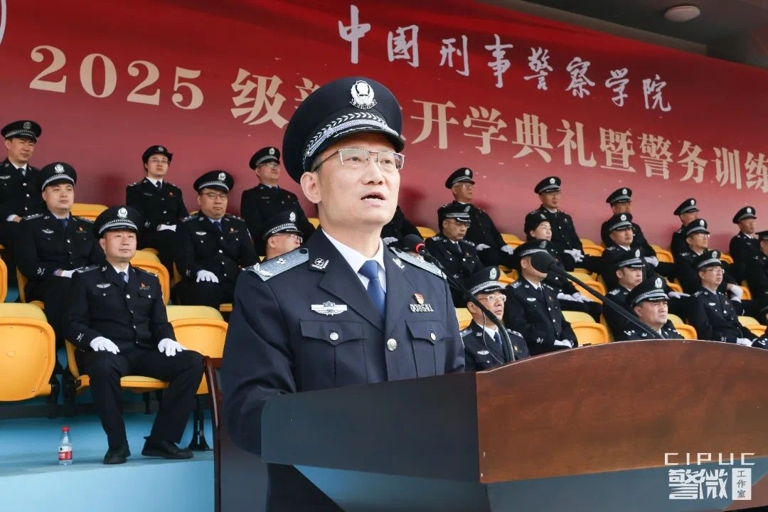 党委副书记、院长王册在致辞中向全体2025级新同学表示热烈欢迎,向部队首长和教官表示衷心感谢,向家长们表示崇高敬意。王册院长指出,今年是中国人民抗日战争暨世界反法西斯战争胜利80周年。在这样特殊的历史节点上,在沈阳这片最早发起抗战的热土上,我们必须铭记历史、缅怀先烈。回望刑警学院所走过的峥嵘岁月,1948年5月,伴随着东北解放的隆隆炮声,肩负着捍卫革命胜利果实、保卫红色初生政权的历史使命,刑警学院的前身——东北公安训练队应运而生,一大批在抗日战争以及解放战争的烽火硝烟中走来的先辈们,合力点燃了新中国公安教育的火种。77年来,一代又一代警院人与党和国家同呼吸、共命运,始终敢为人先、勇立潮头、铸剑报国,创造了公安教育史上多个“第一”和“唯一”,用实际行动擦亮了“中国刑警的最高学府”的闪耀荣光。