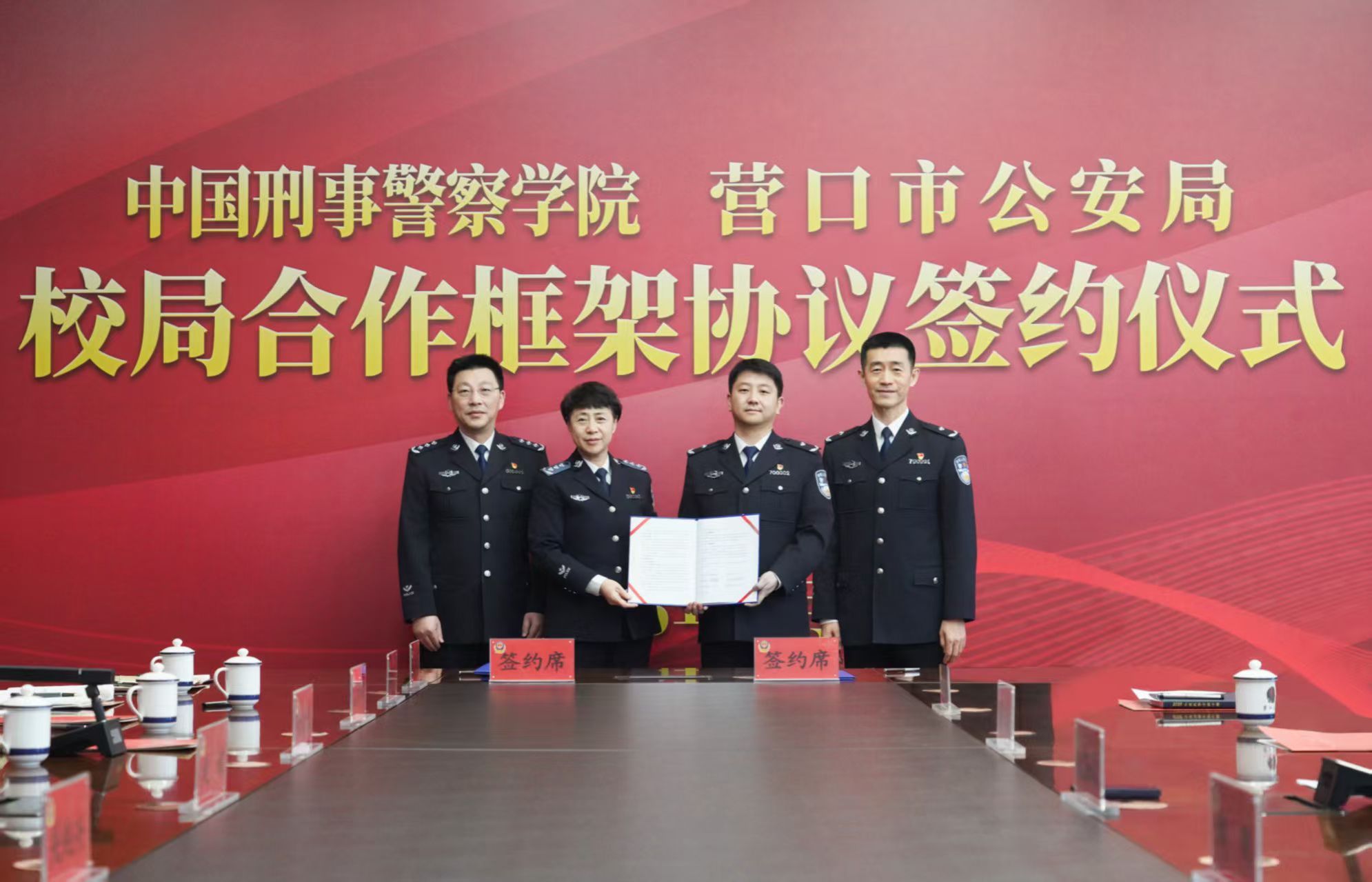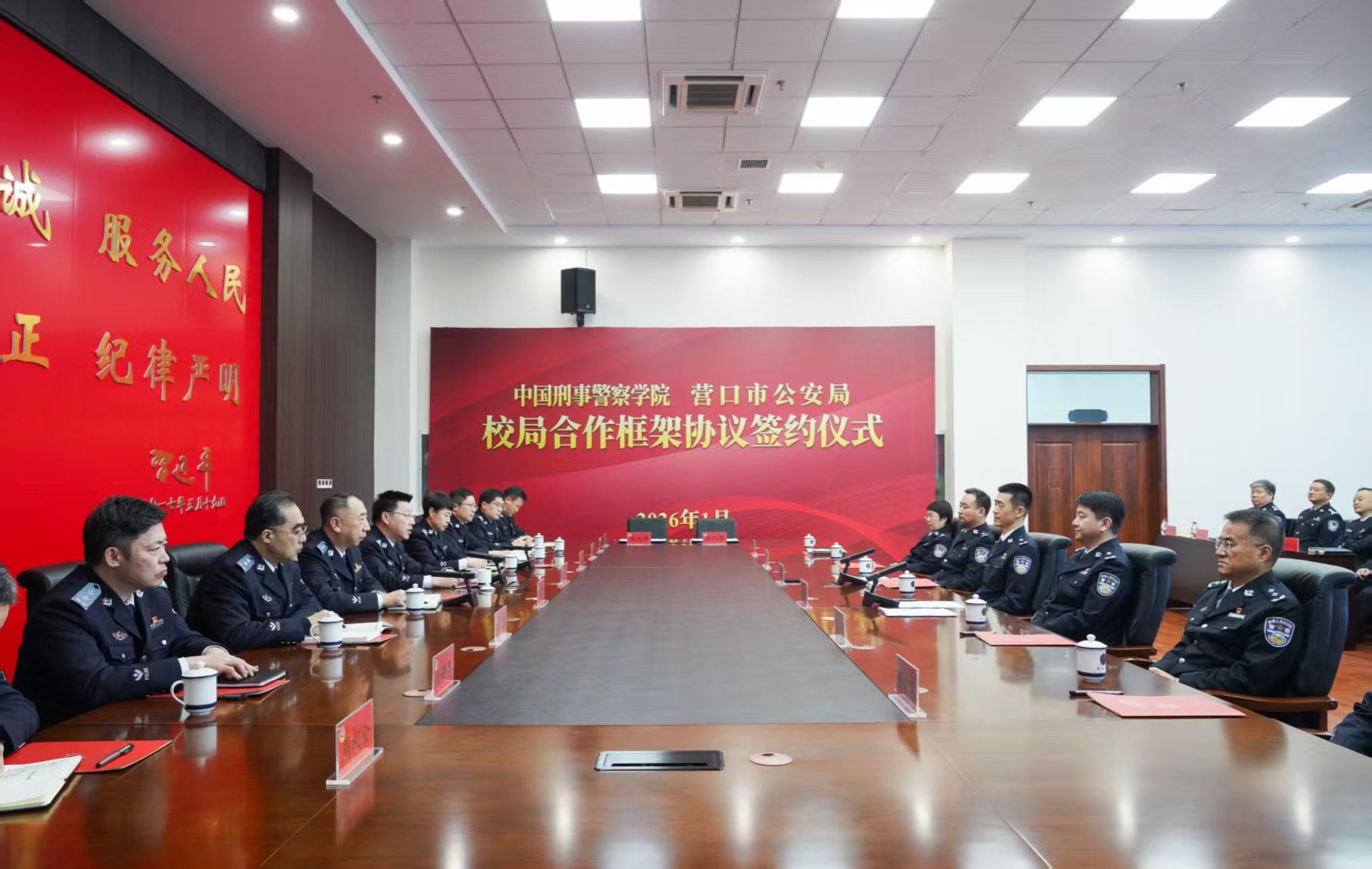 仪式上,赵斌书记简要介绍了学校办学育人、服务实战等工作情况,高度评价营口公安在护航高质量发展大局中取得的优异成绩。赵涵斌副市长对学校领导一行表示热烈欢迎,高度赞誉学校发展成就,对学校给予营口公安的支持帮助致以衷心感谢。双方对后续深化合作提出了美好展望,并围绕队伍建设、科技创新、民警培训、智慧公安等领域进行深入交流。