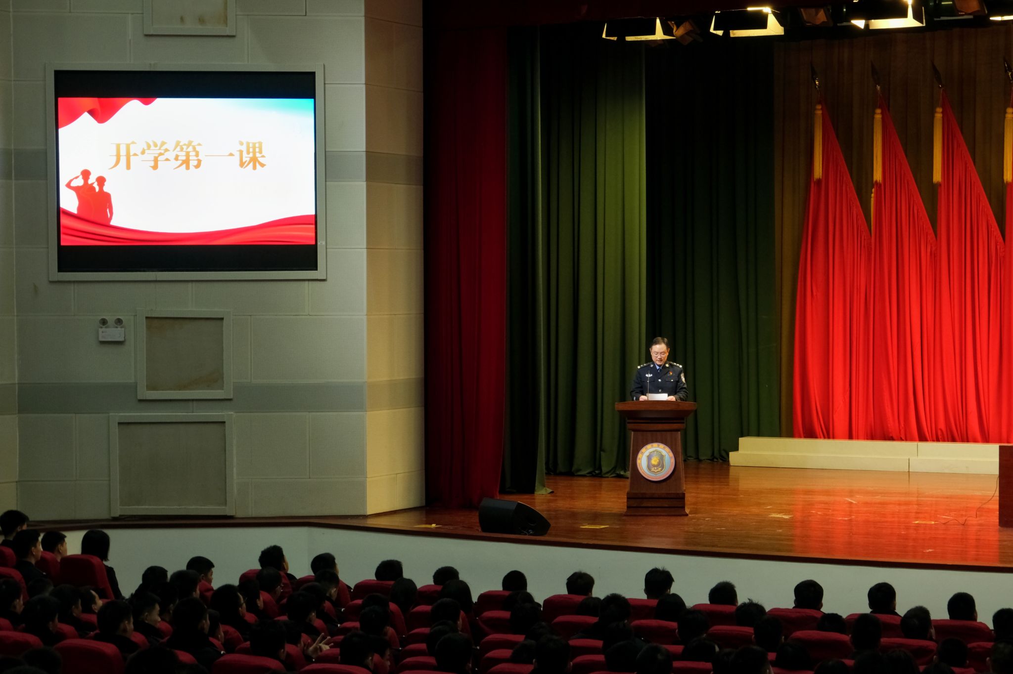 活动伊始,与会全体师生庄严肃穆,奏唱中国人民警察警歌,以满腔热忱告慰英雄。党委书记郝冬为全体学警讲授开学第一课,他提出三点要求:一是要筑牢思想根基,深刻认识英雄精神的时代内涵,坚定从警初心。要从英雄故事中感悟初心、汲取力量,学习英雄精神、传承红色基因,把爱国情、强国志、报国行融入血脉。二是要锤炼过硬本领,以勤学苦练夯实能力基础,扛起使命担当。要深入钻研公安业务知识,吃透理论精髓、掌握专业原理。同时,要强化实践锻炼,在实践中熟悉公安工作流程、锤炼实战技能,不断提升分析问题、解决问题的能力。三是要涵养综合素养,严守纪律规矩,时刻绷紧自身安全这根弦。要加强自身素质培养,既要锤炼品德修为,也要注重德智体美劳全面发展。同时,要时刻强化自身安全意识,牢固树立“安全第一”的思想,在校园生活和实践活动中提高自我防范能力;