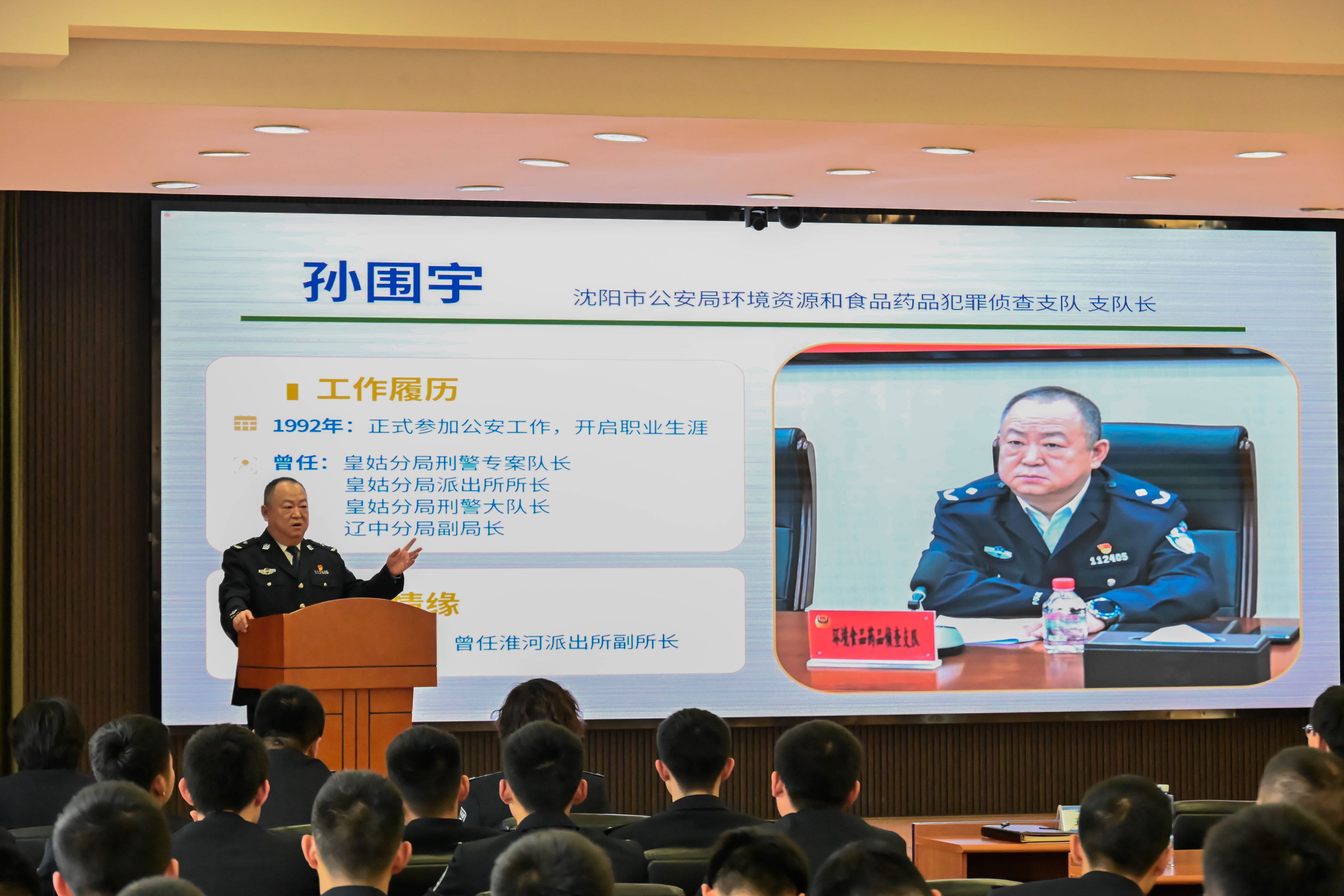 在学术报告环节,沈阳市公安局环食药侦支队支队长孙围宇作了题为《新质赋能除弊疾 铁警砺剑守民生-环食药侦的时代使命与担当》的专题学术报告。孙围宇支队长结合多年一线实战经验,系统阐释了环食药侦警种“名字最长、业务最广、分量最重”的独特定位,介绍了支队依法管辖的环境资源、食药安全、知识产权、公共卫生四大领域38种罪名,生动诠释了环食药侦警察的民生担当,分享了沈阳环食药侦领域的实战成果,