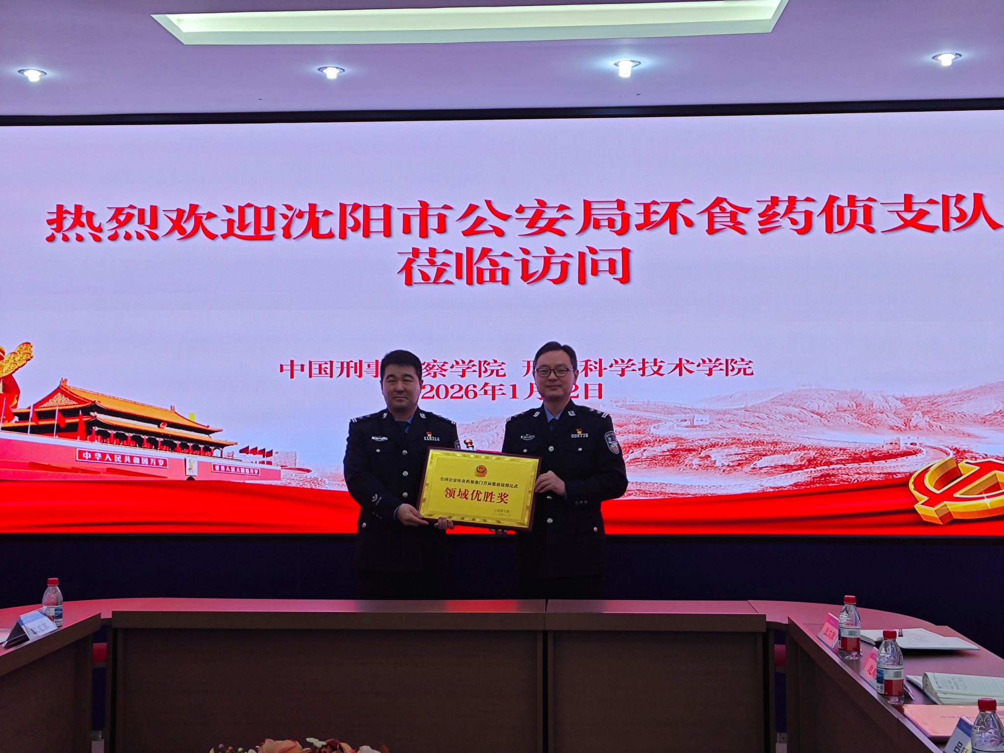 交流会上,孙围宇支队长代表沈阳市公安局环食药支队,向刑事科学技术学院赠送了全国公安环食药侦部门首届数据建模比武一等奖奖牌、自然资源领域优胜奖奖牌并转呈了沈阳市公安局的感谢信。