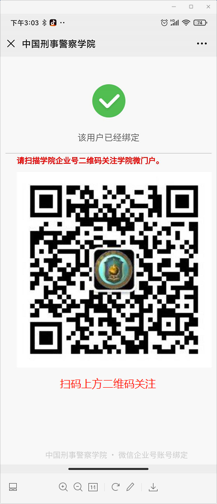 步骤三 提示绑定成功,如图,识别手机屏幕上二维码关注企业号