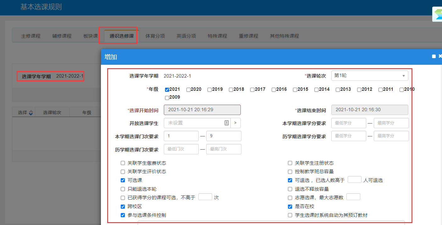 b.基本规则设置:根据学校的选课要求填写相关设置。